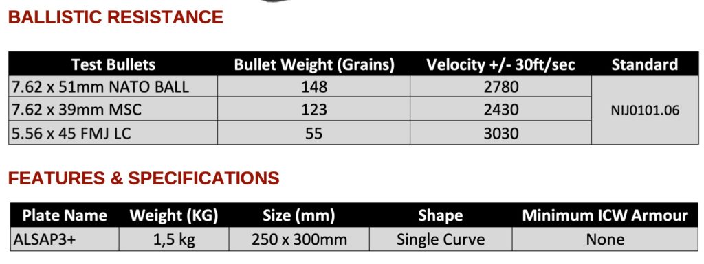 Placas Balísticas de varios niveles del tipo ICW o SA. Niveles III, III+, IV.